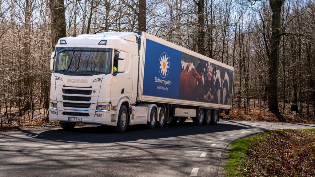 Sedan 2025 har Skånemejerier två ellastbilar som körs i egen regi och ytterligare två ellastbilar som körs av externt åkeri. Vi ser positivt på en ökad elektrifiering inom tunga transporter och deltar i regionala initiativ som Skånes Elektrifieringslöfte och Nätverket för elektrifiering av Skånes transportsektor.